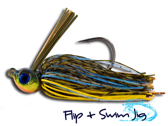NorthStar Custom Baits Flip and Swim jig is a very versatile grass style jig, the 3x 30 degree round bend hook allows for rock hard hooksets whether you are fishing the heaviest cover on the lake, or swimming the 1 ounce model underneath a canopy of milfoil! The Pointy head and swept back weedguard allow this jig to snake its way through heavy cover, while the wide base means your jig isn't tipping over when it hits the bottom! These jigs also feature a 60 strand hand tied silicone skirt, 3d eyes that are glued and then epoxied over, and granite like powder paint that is attractive yet very resilient! In testing we did everything from bomb the 1oz model way back into the nastiest pads we could find and swimming it back out, to pitching heavy cover, and swimming around, under, and through all types of grass, whatever YOU do with this jig, we recommend you use a stout rod, heavy line, and hang on, cause the fish love to punish the Flip and Swim!